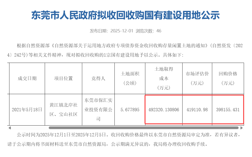 然而,风光不过四年半的光景。根据最新的公示,该地块的市场评估价已降至约41.9亿元,政府最终的拟回购价格为39.8亿元。