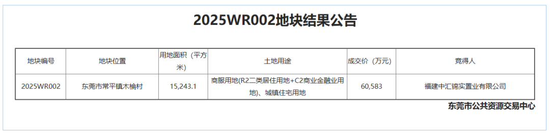 2025年7月,常平镇一宗城中村改造安置房用地编号为2025WR002地块,经过4家房企109轮竞价,以约6.06亿元成功出让,溢价约1亿元。