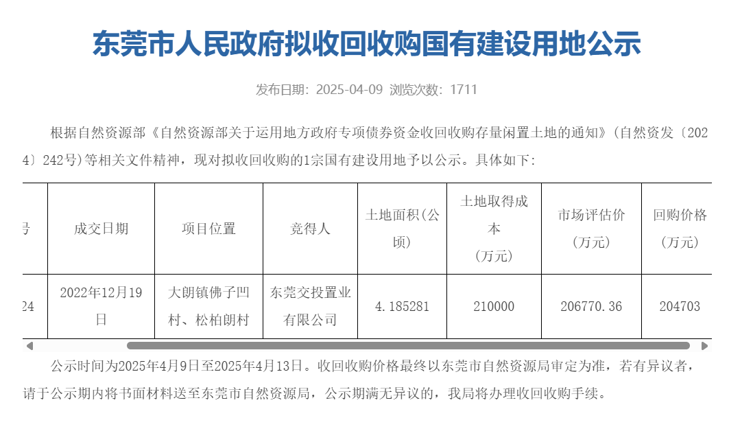 除去公开市场挂牌出让的土地,更早的1月中旬,因莞深高速改扩建工程需要,寮步镇一宗国有建设用地也被依法收回。
